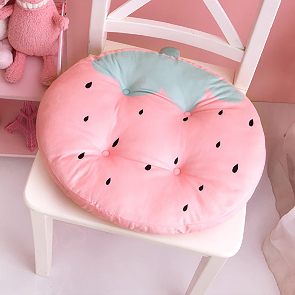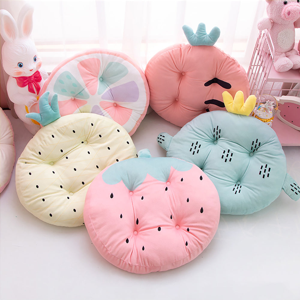 These cute plush fruit seat cushions are available in 7 designs of strawberry . pomelo . watermelon . cactus . apple . pineapple . and carrot. These will surely bring sweetness and cuteness to your kawaii life.